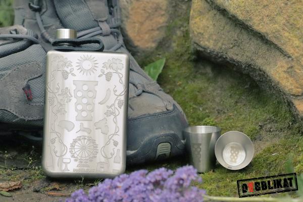 Der Dubblikat Flachmann ist aus Edelstahl gefertigt. Auf seiner Oberfläche sind Symbole eingelasert die man u.a. typischerweise mit der Pfalz in Verbindung bringen kann. Um bei ihm für einen besonderen Glanz und einer geschmeidigen Haptik zu sorgen, wurde er zusätzlich mit einer silbergrauen Beschichtung überzogen.