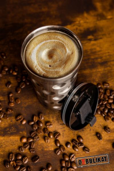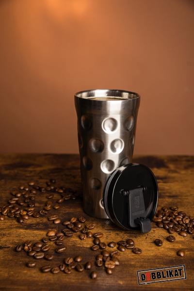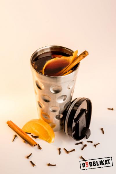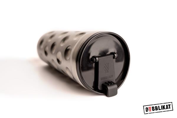 Der Heiße Pfälzer von Dubblikat ist aus Edelstahl und hält, aufgrund seiner doppelwandigen Ausführung, die Getränke länger heiß oder kalt. Der aufsteckbare Kunststoffdeckel hat eine wiederverschließbare Trinköffnung. Der Verschluss hat eine Arretierung die verhindert, dass er beim Trinken auf die Nase zurückfällt. Der Kunststoffdeckel hat eine umlafende Dichtung, die ihn sicher und fest auf dem Thermobecher hält. Der Heiße Pfälzer darf nicht mit einer Thermoskanne mit Schraubverschluss verglichen werden, daher empfehlen wir ihn nicht im befüllten Zustand hinzulegen (Deckel und Trinköffnung sind nicht dichtschließend).